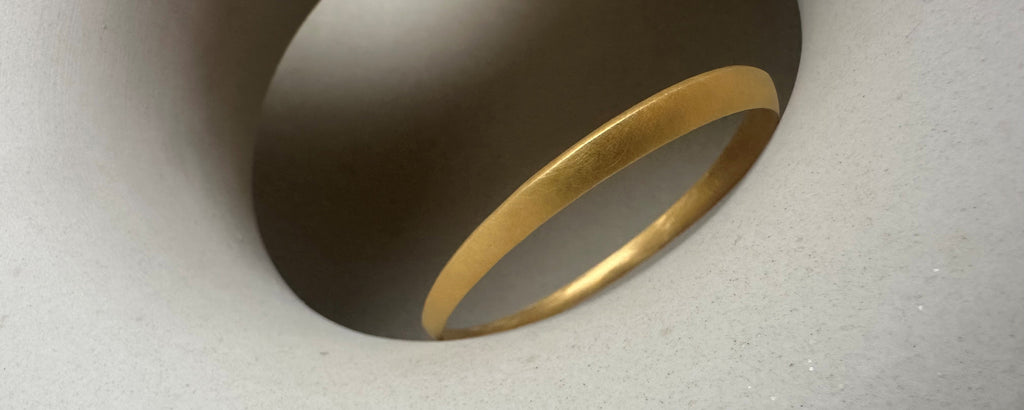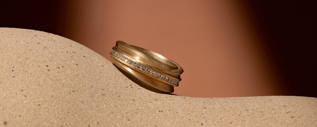 "Sarah’s work feels both naturally sculptural and architecturally-minded which suits our aesthetic to a T. We wanted wedding bands which felt timeless yet still playful, and the Signature Tapered Ring ticked that box perfectly.