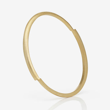 Defined by a fluid yet distinctive shape, this fine-weighted bangle features an off-set join that creates a modern elegance through geometric juxtaposition. Handcrafted from 9ct yellow gold with our signature brushed matte finish, it’s complemented perfectly by matching hoop earrings. Hallmarked and also available in sterling silver.