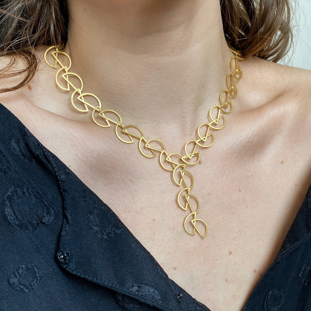 Be bold with this geometric necklace, handcrafted from sterling silver with 18ct gold plate in our signature brushed matte finish. It’s adjustable in length and can be worn the way you want to wear it. Complemented perfectly by matching earrings. Hallmarked and also available in silver.