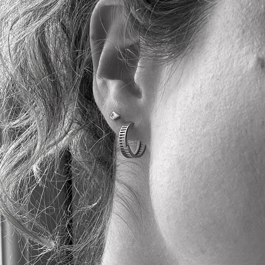 These contemporary single earrings feature asymmetric 'whistle-cut' white diamonds. Using simple bezel settings to accentuate the geometric shape of the stones, they're perfect to layer with other earrings. Featuring our signature brushed matte finish and London Assay Office hallmark.
