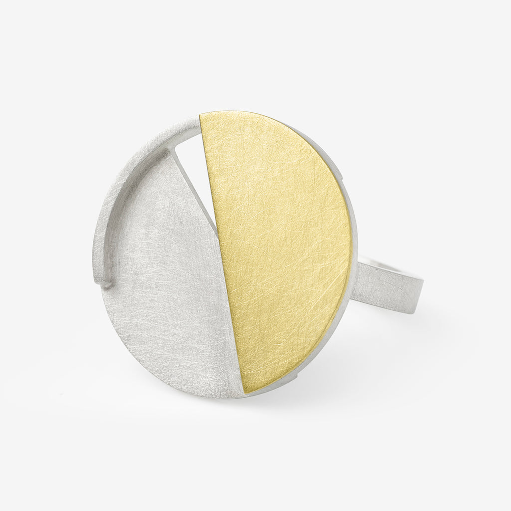 Bold, simple and refined, this ring is handcrafted from sterling silver and 18ct gold. Featuring a unique juxtaposition of precious metals and our signature brushed matte finish, its iconic design accentuates a contemporary, clean look. Hallmarked and made to order (non-refundable).