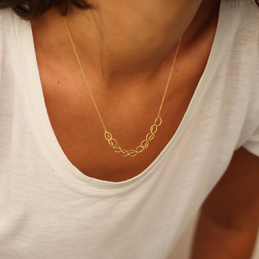 Elegant and simple, this iconic necklace is handcrafted from 18ct yellow gold with our signature brushed matte finish. Each link is made by hand and unique, as is the clasp. Perfectly complemented with matching earrings. This item is hallmarked and photographed on model in 18" length.