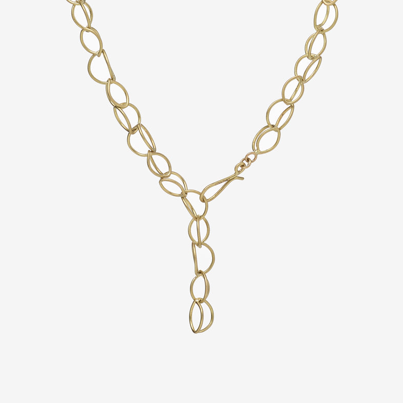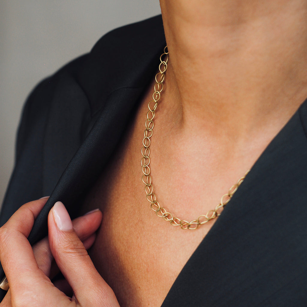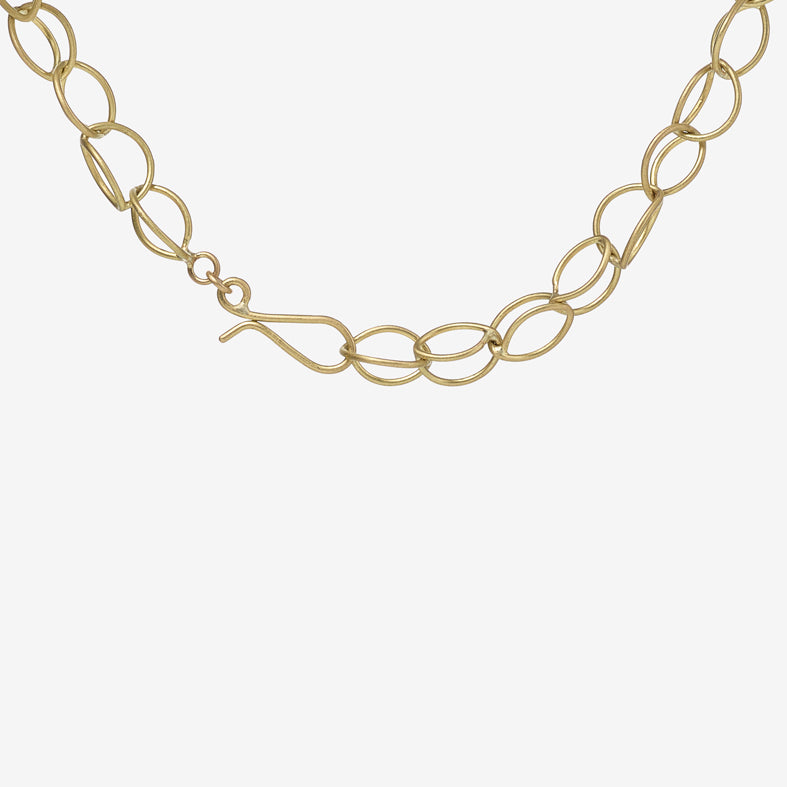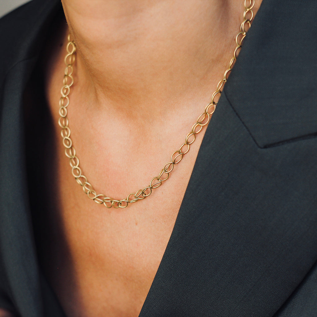 Elegant and simple, this iconic chain is handcrafted from 18ct yellow gold with our signature brushed matte finish. Each link is made by hand and unique, as is the clasp. Perfectly complemented with matching earrings. This item is hallmarked and photographed on model in 18", however the length is adjustable as shown.