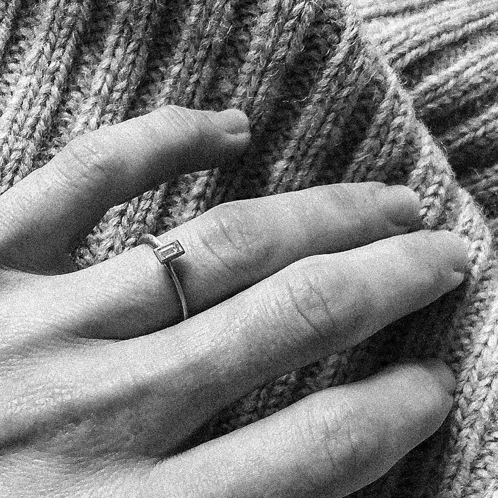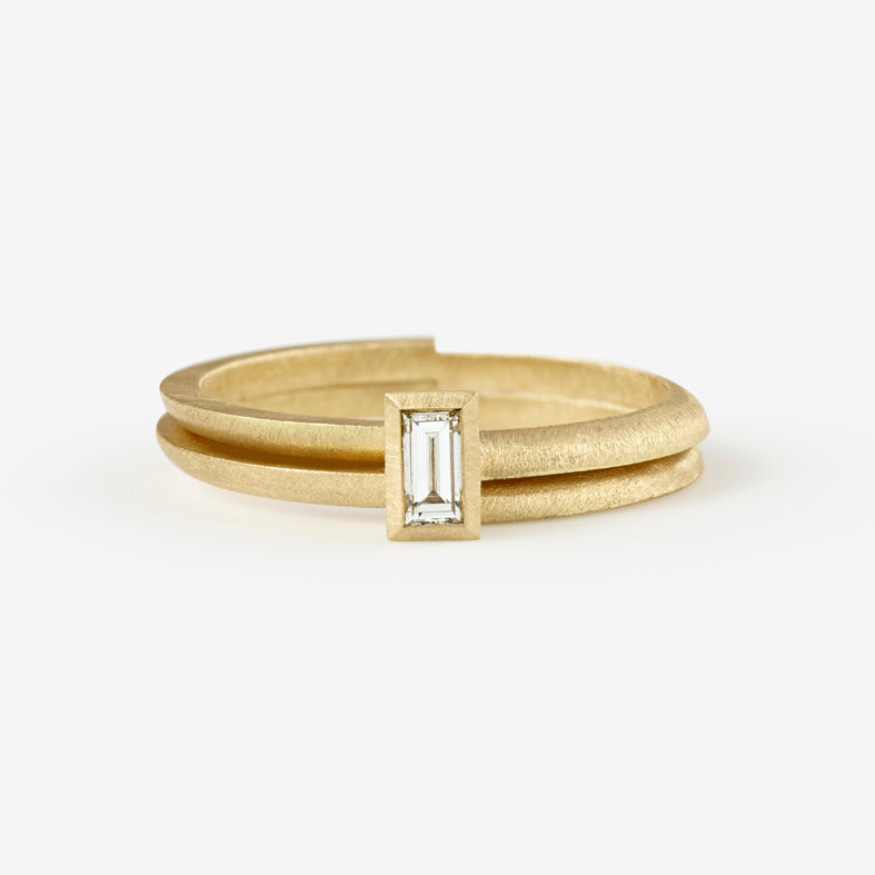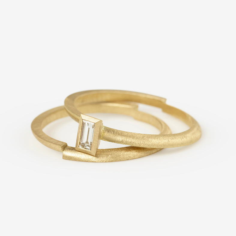 Angular, subtle and striking, this architecturally-minded engagement ring showcases a colourless baguette diamond set within 18ct yellow gold. Designed to be stacked with the Ivana Ring (as photographed) for a contemporary bridal statement, it's hallmarked and available in our signature brushed matte finish.