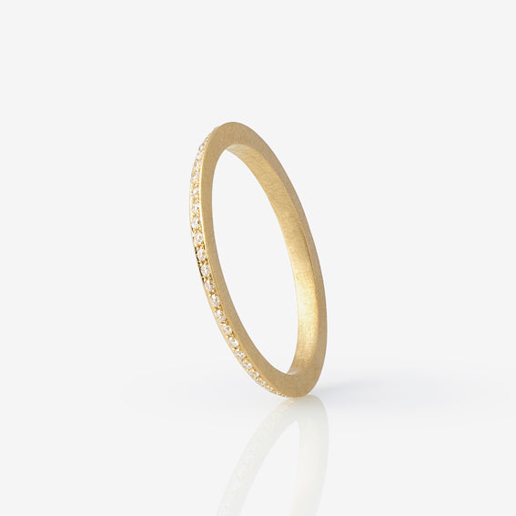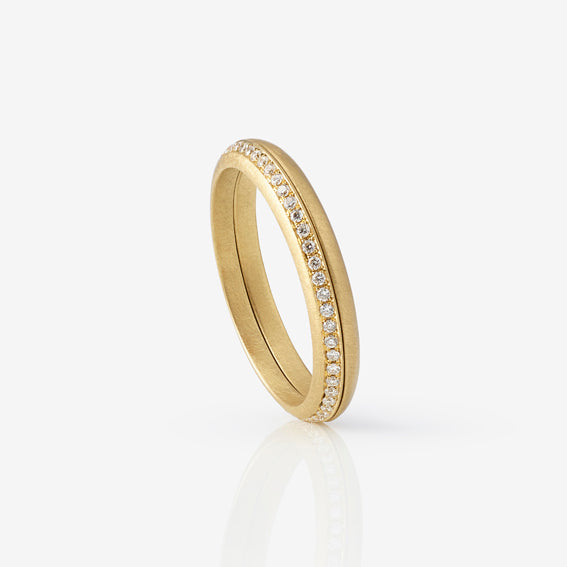 With a contemporary elegance, this eternity ring is crafted from 18ct yellow gold and brilliant-cut round diamonds. Available in both brushed matte and polished finishes, it can stack perfectly as an engagement and wedding set stacked with the Ivana Simple Ring, as shown. Hallmarked and also available in white or rose gold.