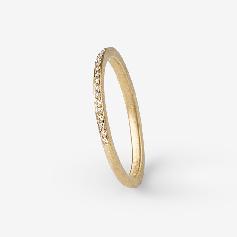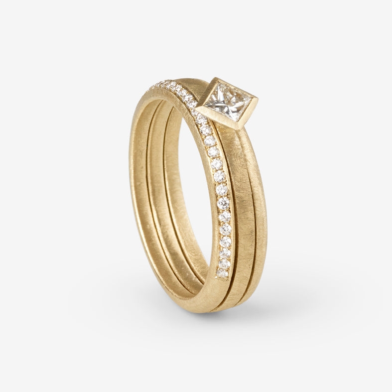 With a contemporary elegance, this half eternity ring is crafted from 9ct yellow gold and brilliant-cut round diamonds. Available in our signature brushed matte finish, it can stack perfectly as an engagement and wedding set stacked with the Princess Cut Diamond Ring, as shown. Hallmarked and also available in white or rose gold.