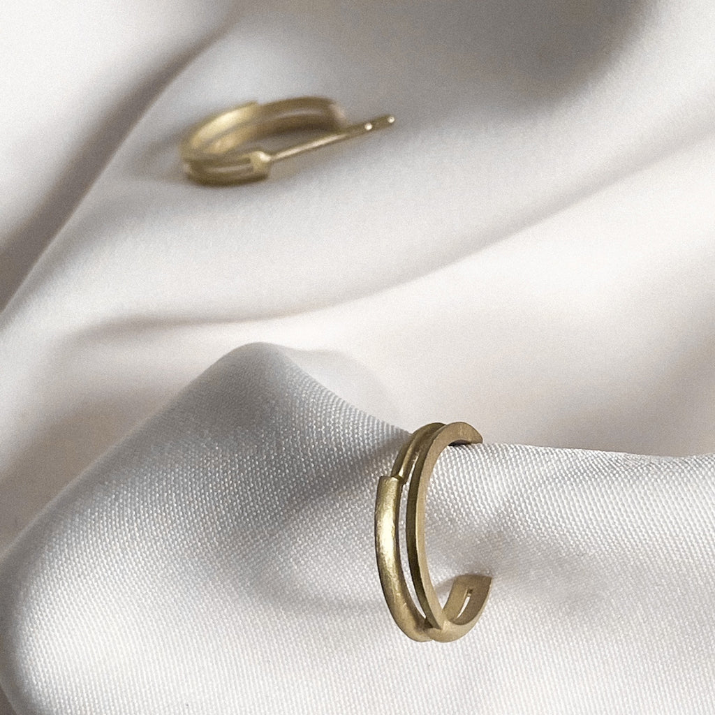Modern elegance meets refined simplicity in these double hoop earrings, featuring two geometric off-set joins and our signature brushed matte finish. They’re handcrafted from 18ct yellow gold, hallmarked and also available to order in white.