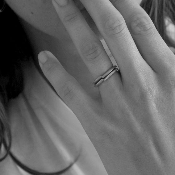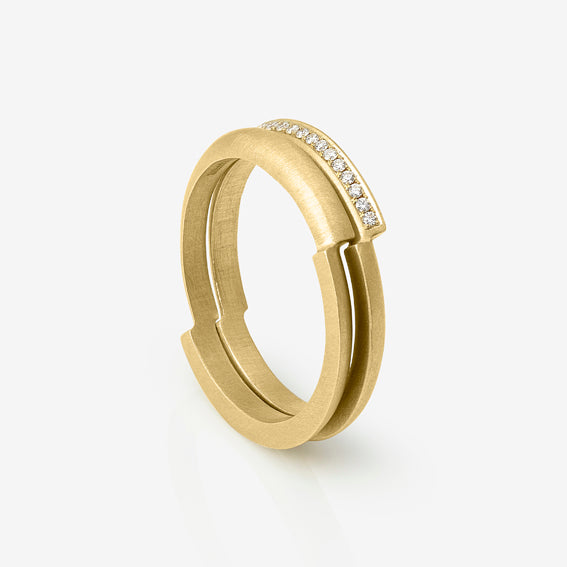 Effortlessly understated and elegant, this architectural ring is crafted from 18ct yellow gold. Featuring a geometric offset join and available in our signature brushed matte finish, it can stack perfectly with the Ivana Quarter Eternity Ring as a contemporary engagement and wedding ring combination, as shown. Hallmarked and also available in white or rose gold.