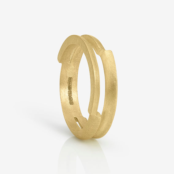 Architecturally-minded, this modernist ring is crafted from 18ct yellow gold. Featuring two geometric offset joins, it’s hallmarked and also available in white or rose gold.