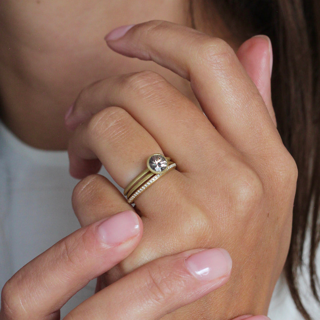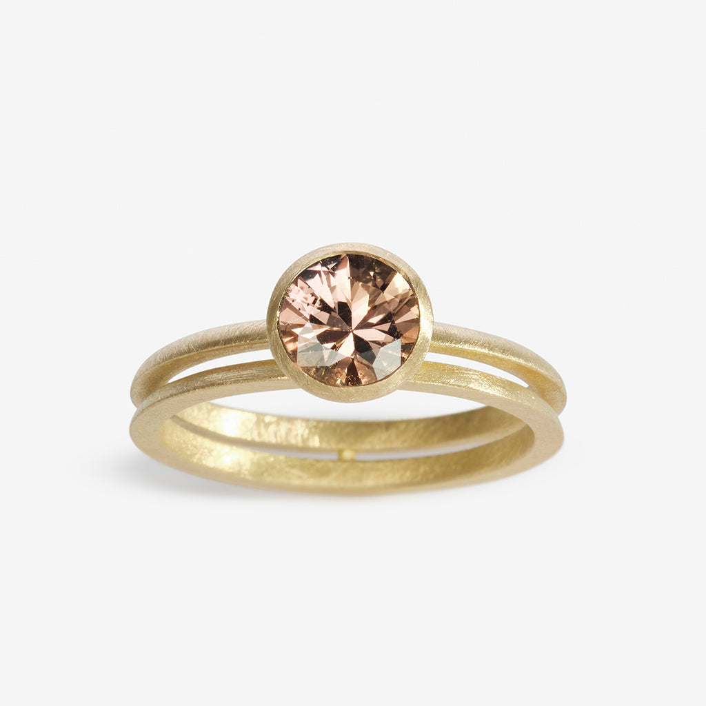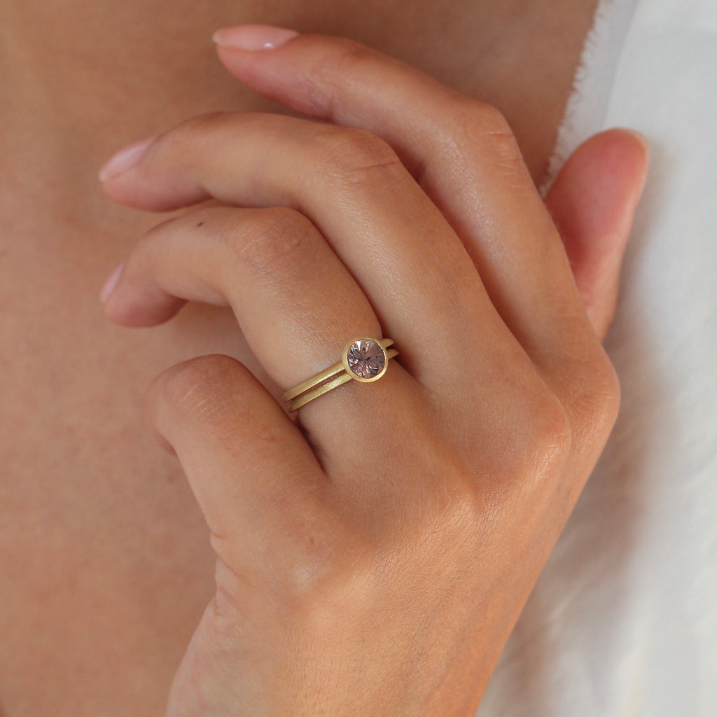 Featuring a double Ivana band, this engagement ring showcases a bezel setting to accentuate the beauty of a warm brown sapphire. Paired with the Ivana Eternity Ring and the Ivana Simple Ring, it can become the visual centrepiece of a modern wedding stack.