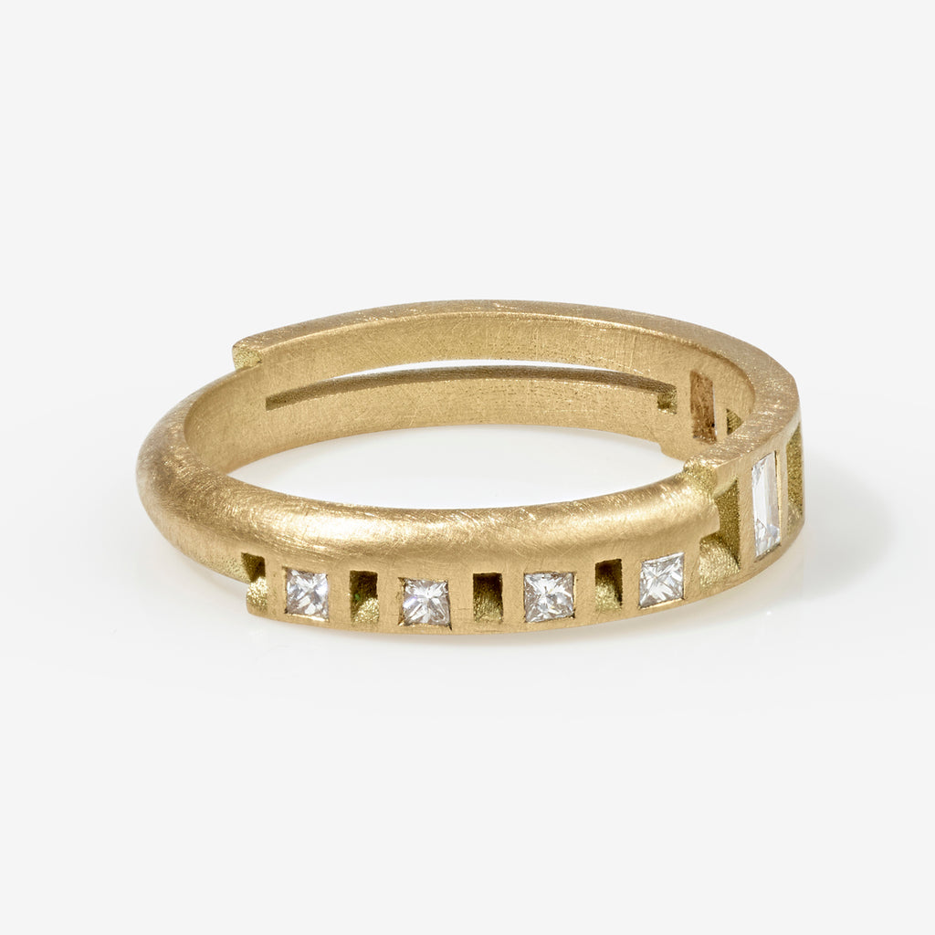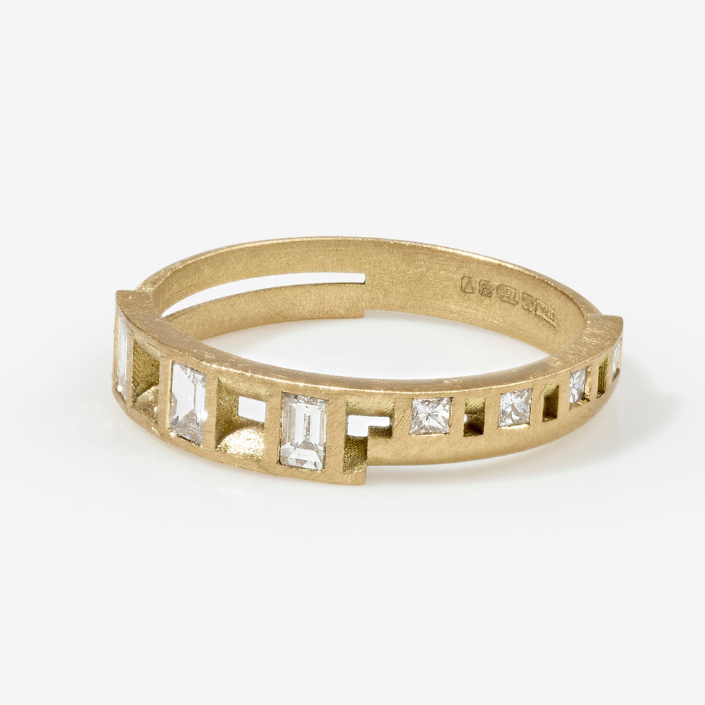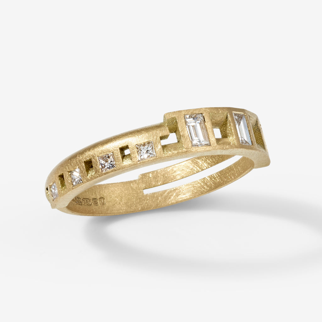 Architecturally-minded, this modernist ring is accentuated with seven diamonds for a beautifully asymmetric aesthetic. Featuring two geometric offset joins, it’s handcrafted from 18ct yellow gold and includes four Princess-cut and three baguette diamonds. Hallmarked, featuring our signature brushed matte finish and also available in either white or rose gold.