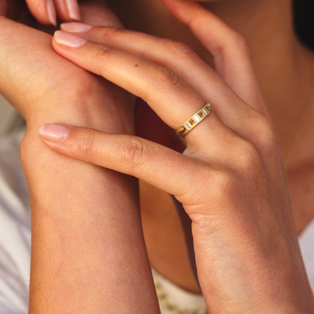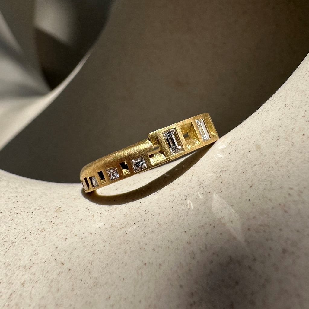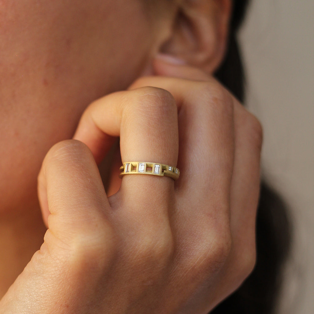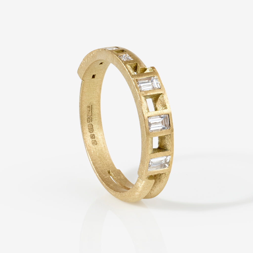 Architecturally-minded, this modernist ring is accentuated with seven diamonds for a beautifully asymmetric aesthetic. Featuring two geometric offset joins, it’s handcrafted from 18ct yellow gold and includes four Princess-cut and three baguette diamonds. Hallmarked, featuring our signature brushed matte finish and also available in either white or rose gold.