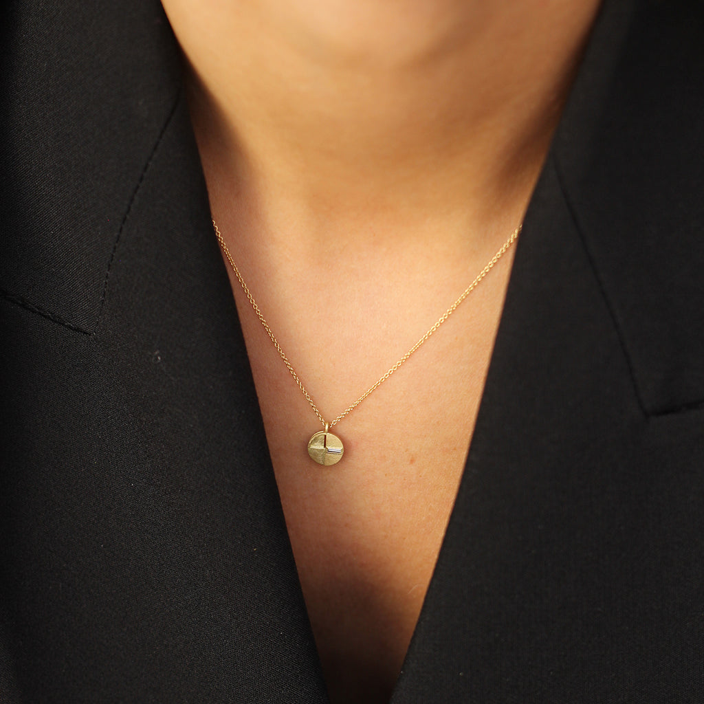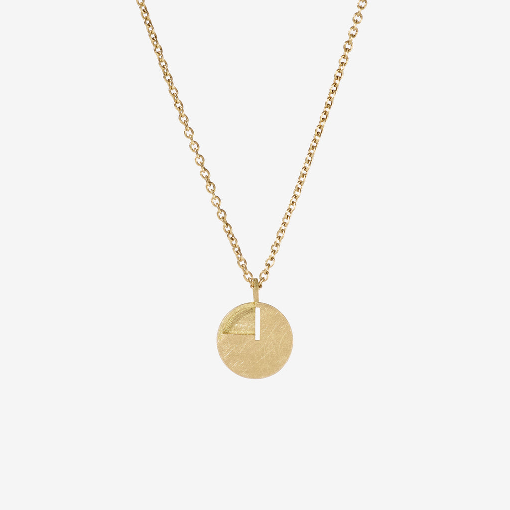 Elegantly geometric and composed over three distinct layers, this minimalist pendant showcases a baguette diamond. Finished on a fine trace chain with a handmade clasp, it’s available in two lengths and is handcrafted from 18ct yellow gold. Shown on model in 18” length, hallmarked and featuring our signature brushed matte finish.