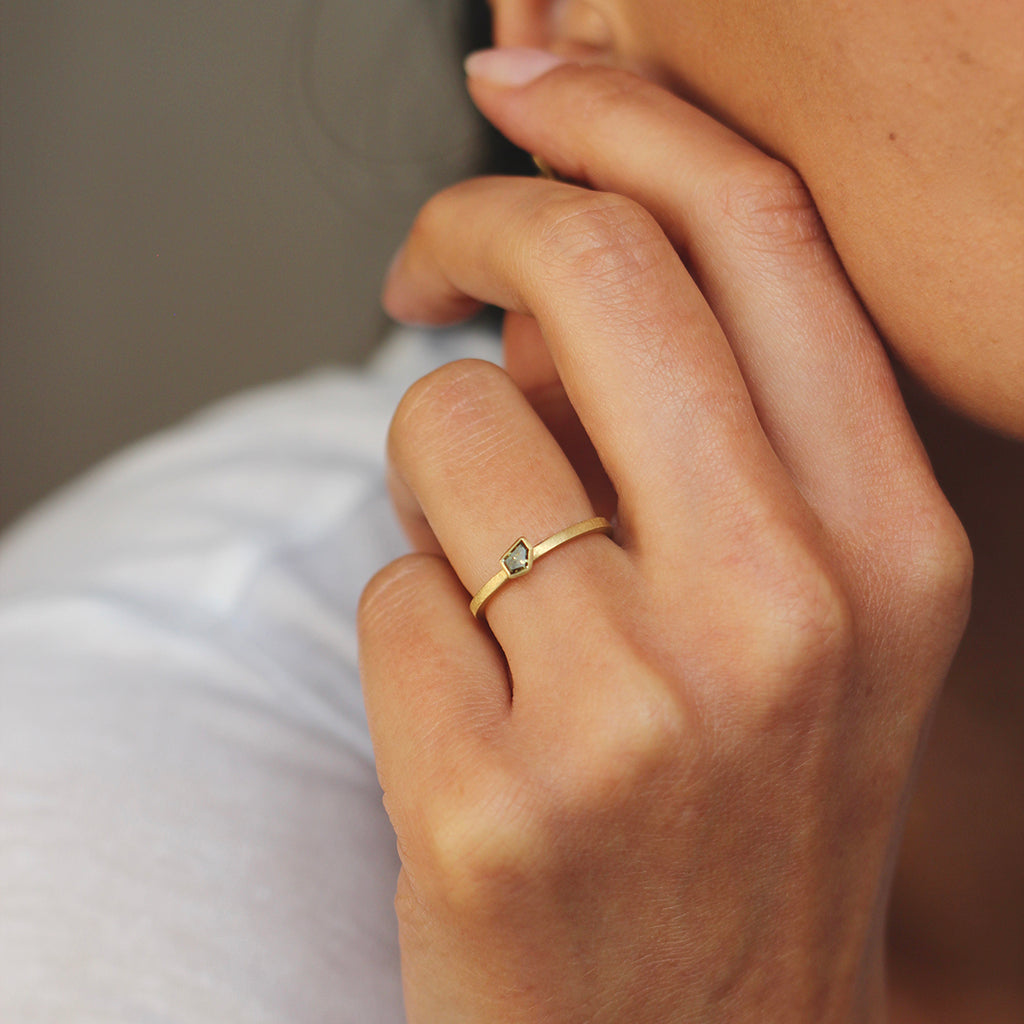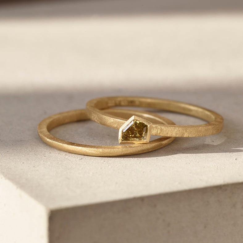With stunning simplicity, this contemporary diamond ring features an asymmetric stone for a sense of modern style. Hallmarked and handcrafted from 18ct yellow gold with our signature brushed matte finish. Paired perfectly with the Ivana Simple Ring as photographed.