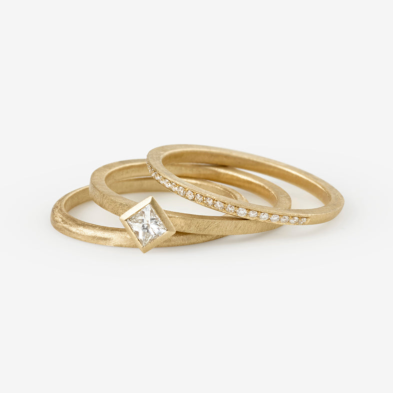 Minimal and elegant, this contemporary engagement ring showcases a colourless, princess-cut diamond set within 9ct yellow gold. Designed to be stacked with the Ivana Simple Ring and Half Eternity (as photographed) as a modern bridal set, it's hallmarked and features our signature brushed matte finish.