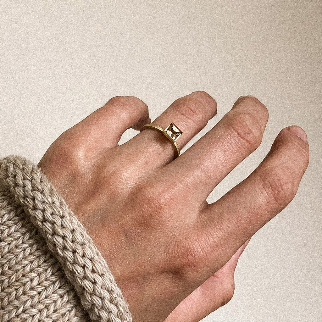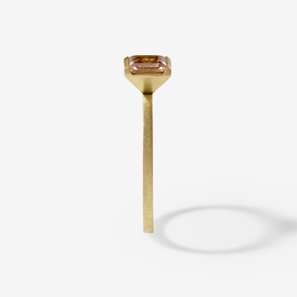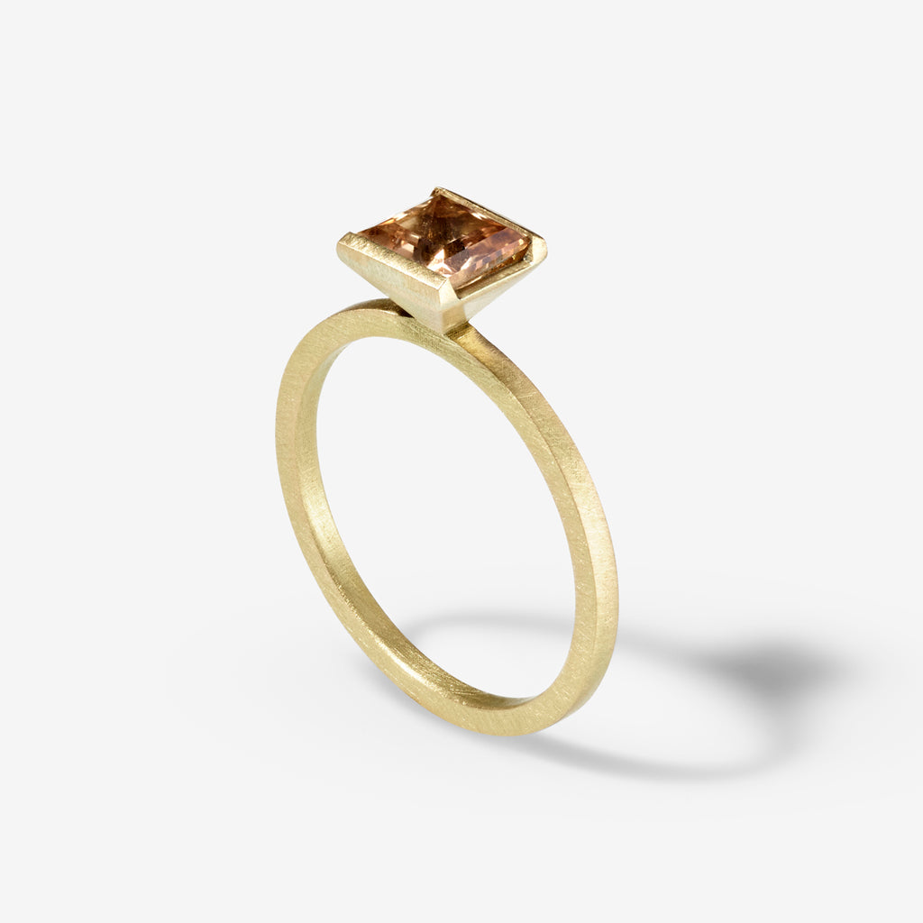 With standout simplicity, this elegantly bold ring showcases a peach-coloured, Princess-cut Tourmaline in a channel setting. It’s complemented beautifully by the Ivana Simple Ring as a contemporary yet classic wedding set. Hallmarked and featuring our signature brushed matte finish.