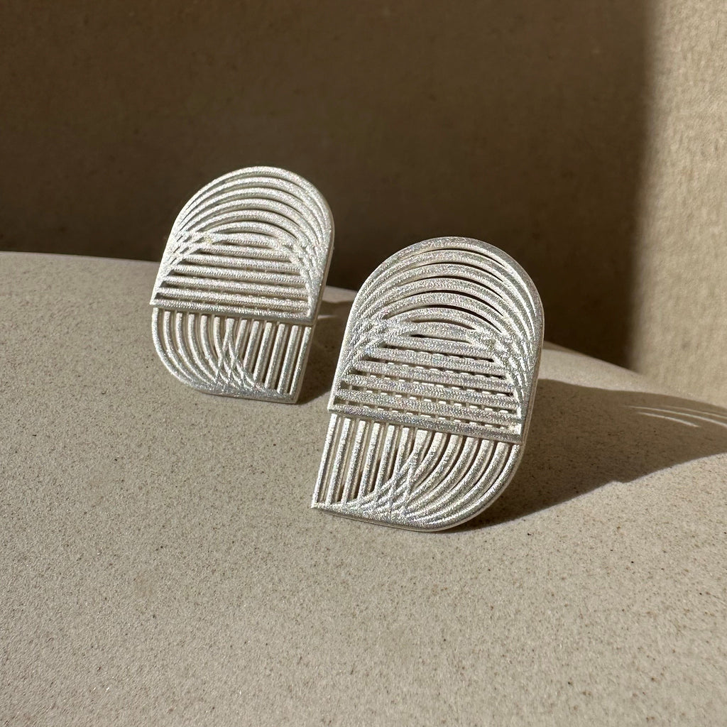 These contemporary graphic earrings explore how light and space interact. The layering of these forms creates negative space and curves that architecturally align. These are crafted from sterling silver, and feature our signature brushed matte finish. Also available in gold plated silver.