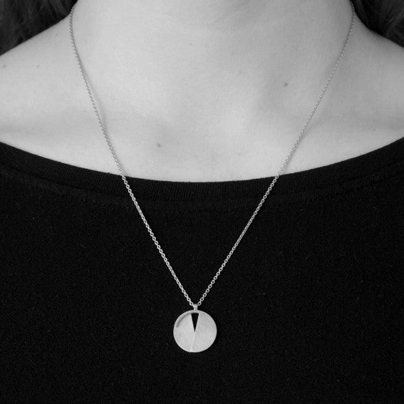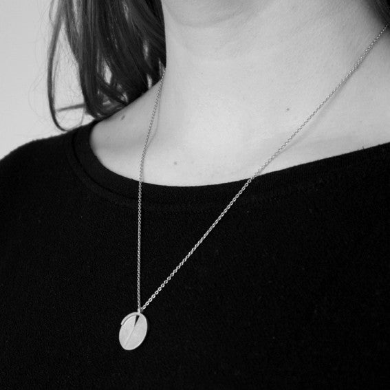 This simple and contemporary pendant is handcrafted from sterling silver with our signature brushed matte finish. Hallmarked and featuring a handmade T-Bar clasp, it's complemented perfectly by matching earrings. Shown on model in 20" length.