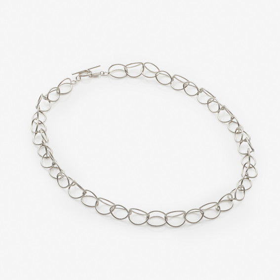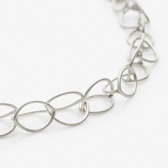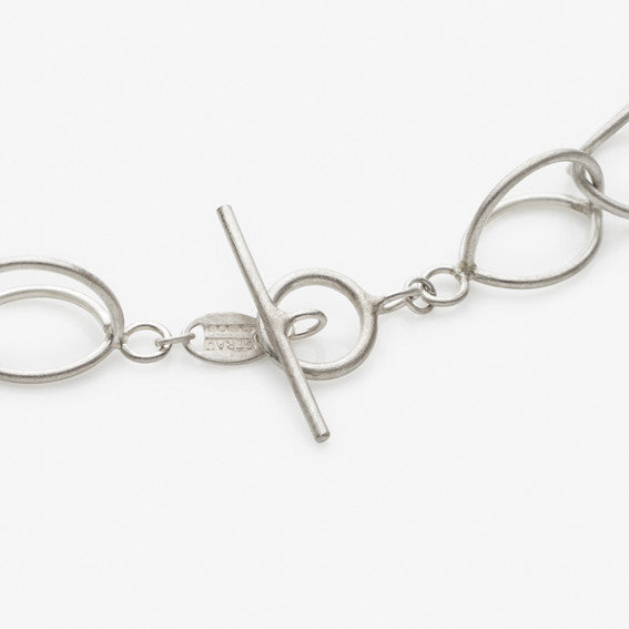 Stunning, elegant and simple, this iconic chain is handcrafted from sterling silver with a beautiful brushed matte finish. Each link is made by hand and unique, as is the T-bar clasp. Perfectly complemented with matching earrings and bracelet. Hallmarked and also available in 18ct gold plate. Shown on model in 18"